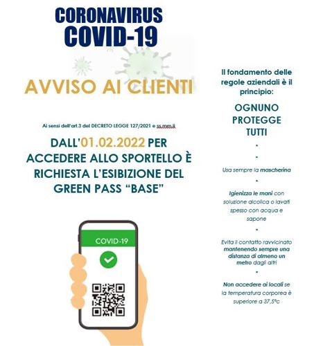 Nuove regole Covid per l'accesso nelle Filiali. Dal 1° febbraio 2022 per accedere alle Filiali è richiesta l'esibizione del green pass "base"
